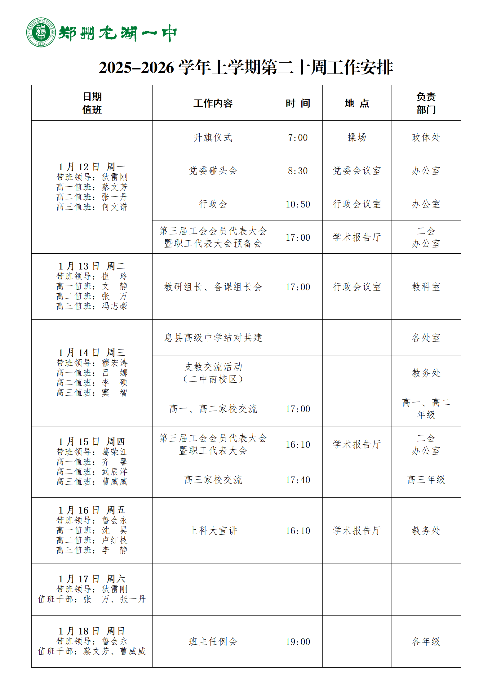 2025-2026学年上学期第二十周工作安排