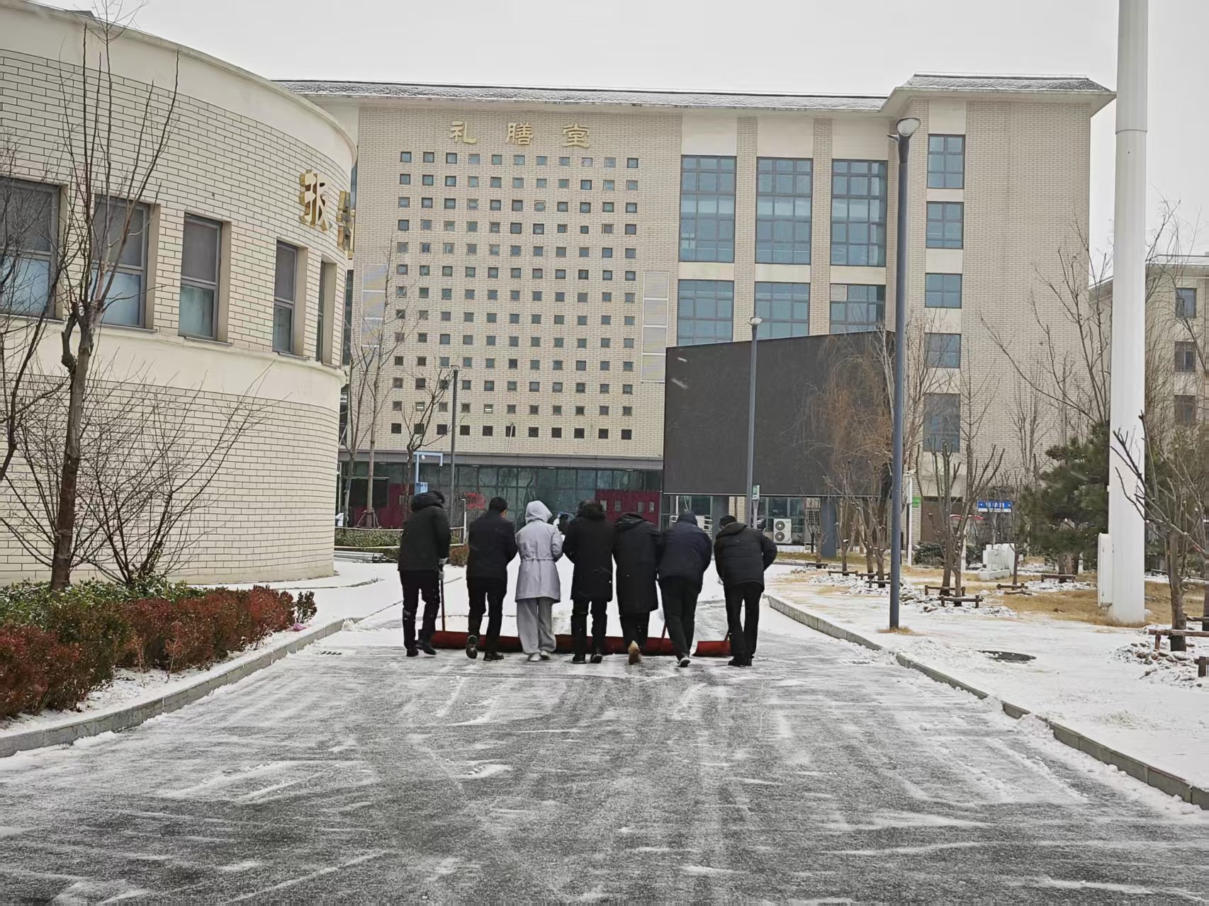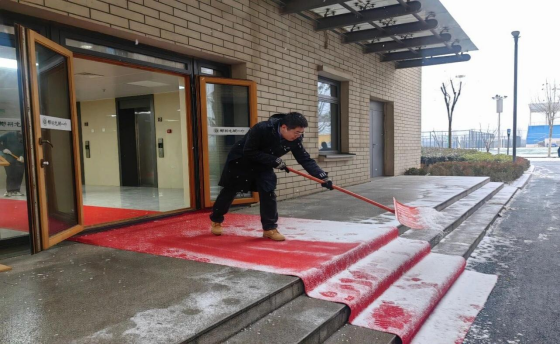 近日郑州市出现暴雪恶劣天气,气温骤降导致校园道路、台阶快速形成积雪结冰,给师生出行安全及正常教学秩序带来极大隐患。郑州龙湖一中坚决践行“雪情为令,安全为要”理念,迅速启动低温雨雪冰冻灾害应急预案,科学部署、高效推进除雪工作,切实筑牢校园安全防护网。总务处作为安全管理部门能够提前预判、主动作为,在暴雪来临前,统筹安排备齐铁锹、推雪板、防滑垫及环保融雪剂等除雪物资。1月19日上午,在校领导号召带领下,总务处主任窦智组织处室、无课教职工及物业人员闻令而动,顶风冒寒、分工协作,有条不紊开展清雪除冰,全力保障校园通行顺畅。